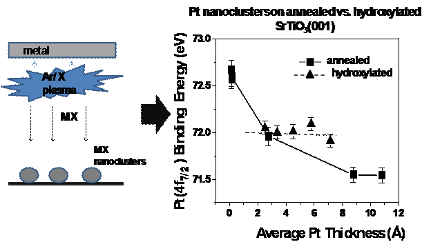 This system features an unmonchromatized MgKα/AlKα dual anode x-ray source, 100 mm mean radius hemispherical analyzer with multichanneltron detector, 500 eV-1000 eV ion gun, and reverse-view LEED system. The system is turbomolecularly pumped (base pressure = 5 x 10-10 Torr) for rapid recovery of UHV conditions. The system is integrated with a separately pumped chamber for atomic layer deposition or magnetron sputter deposition at temperatures up to 700 K . Sample transport between chambers occurs under UHV conditions. Representative results for PVD of Pt nanoclusters on clean vs. modified SrTiO3(001) surfaces are shown in Figure 2.