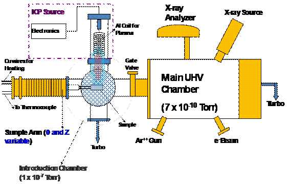 The XPS/plasma deposition chamber enables surface exposure to capacitively-coupled plasma under controlled conditions (gas or mixture, pressure, power, sample temperature) followed by transition to the XPS system for surface analysis. The introduction chamber also contains apparatus for optical emission spectroscopy in the UV-VIS range. The XPS chamber features a dual-anode MgKα/Alkα x-ray source, and a 100 mm mean radius hemispherical with channeltron detector, ion gun, and electron gun.