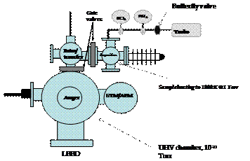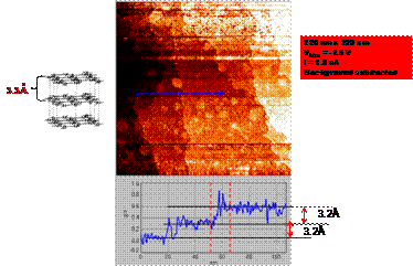 This system allows atomic layer deposition by exposures to reactive gases at pressures > 1 Torr and temperatures up to 1000 K, followed by purging, pump down and transfer to UHV. The UHV chamber features ambient temperature STM and AFM, Auger electron spectroscopy and electron energy loss spectroscopy, ion gun, and reverse-view low-energy electron diffraction. A constant-current STM image and line scan of an ultrathin h-BN(111) film grown on Ru(0001) surface are shown in Fig. 2.